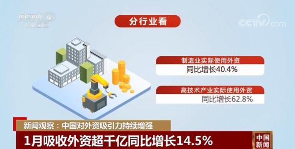 商务部昨天(2月20日)发布的数据显示,1月份实际使用外资金额达1276.9亿元,同比增长14.5%;折合190.2亿美元,同比增长10%。专家分析称,中国依然是外商投资兴业的热土,今年政策层面将更大力度促进外资稳存量、扩增量,中国对外开放的广度、深度和力度都将更进一步,中国市场对外资的吸引力持续增强。