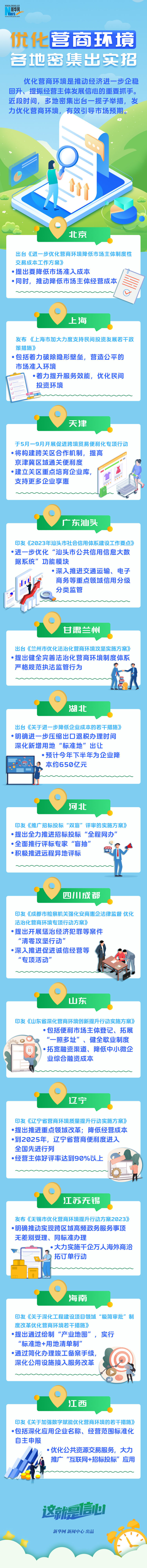 优化营商环境 各地硬招、实招频出 来源:新华网 更新时间:2023/6/12 浏览: 优化营商环境是推动经济进一步企稳回升、提振经营主体发展信心的重要抓手。近段时间,多地密集出台一揽子举措,发力优化营商环境,有效引导市场预期。